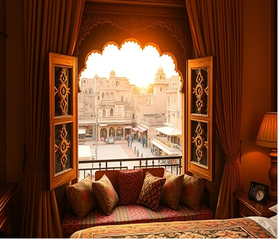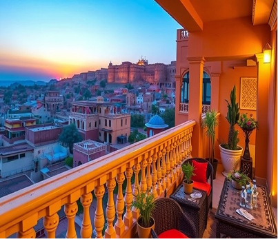 Choose between two elegant room categories in a prime city-center haveli, offering stunning Fort and city views just steps away from Jaisalmer Fort.